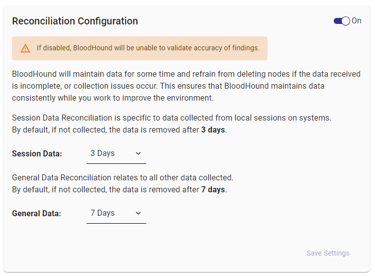 BloodHound Enterprise (BHE) implements data retention, i.e., a time-to-live where data that has not been collected and ingested for a certain period will get deleted from BHE. This retention period is configurable and is by default:- Session Data, i.e. HasSession edges: 3 days