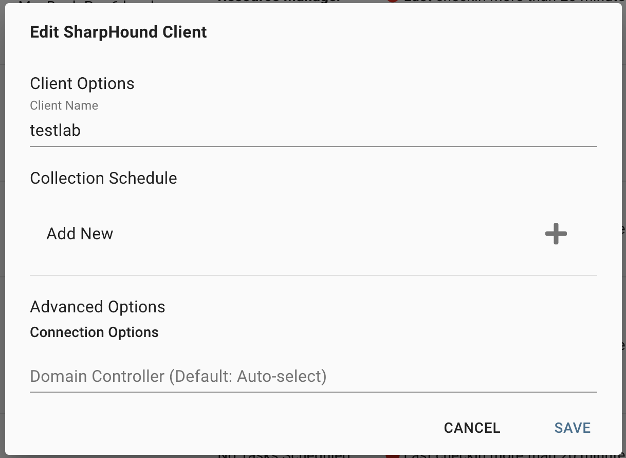 Advanced Options -> Domain Controller | By default, SharpHound automatically selects a Domain Controller for LDAP queries. Specifying a Domain Controller hostname or FQDN here will define the default value utilized on all scheduled collections. We recommend not configuring a Domain Controller manually. |
