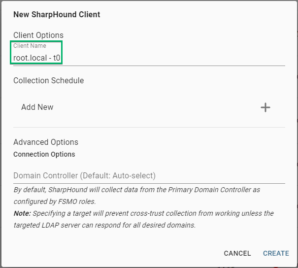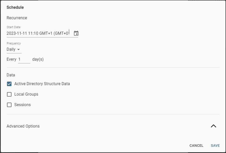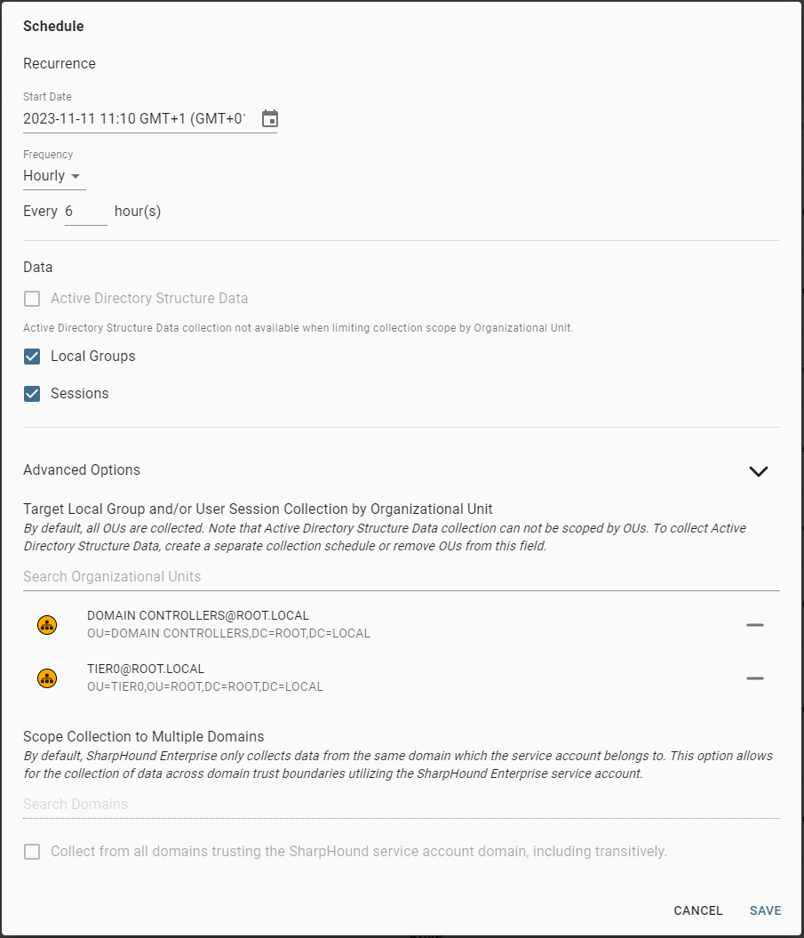 Only one AD Structure Data schedule is needed, even though multiple tiers exist. It is recommended to be collected by the Tier Zero collector, as the clients of other tiers may be denied read access to Active Directory structure data.- On the Tier Zero collector client, create a new collection schedule, see Create a data collection schedule