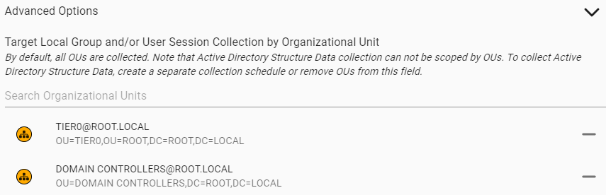 - In Advanced Options in the setting Target Local Group and/or User Session Collection by Organizational Unit, search for the Tier Zero OU(s) containing the domain’s Tier Zero computer objects.